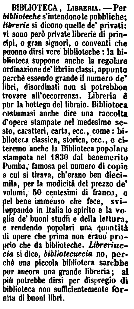 | Libreria, Biblioteca - Libreria è propriamente la bottega dove si tiene in vendita ogni sorta di libri, e se ne fa commercio anche in grande. - Biblioteca è luogo dove sono raccolti, ordinati e custoditi libri di ogni maniera, per comodo degli studiosi. Sono pubbliche e private: nelle prime ciascuno può andarvi; nelle private ci bisogna la licenza del padrone; ma queste spesso sono a pura mostra di lusso e di magnificenza. - [Libreria a Firenze si dice familiarmente anche la Biblioteca, pubblica o privata che sia. Biblioteca, parlandosi della stanza ove un privato tiene i suoi libri e ci studia, parrebbe affettato, e si dice invece Libreria. Così il Giusti nella Terra de' morti: