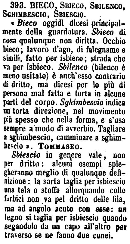 | Bieco, Sbieco, Sbilenco, Sghimbescio, Sbiescio - « Bieco oggidì dicesi principalmente della guardatura. Sbieco di cosa qualunque non diritta. Occhio bieco; lavoro d'ago, di falegname e simili, fatto per isbieco; strada che va per isbieco. Sbilenco (bilenco è meno usitato) è anch'esso contrario di dritto, ma dicesi per lo più di persona mal fatta e torta in alcune parti del corpo. Sghimbescio indica un torta direzione, nel movimento più spesso che nella forma, e s'usa sempre a modo di avverbio. Tagliare a sghimbescio, camminare a sghimbescio ». Tommaseo.