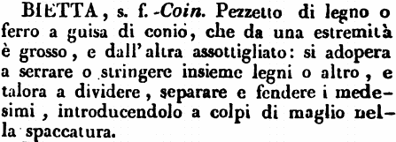 | Bietta - s. f. Coin. Pezzetto di legno o ferro a guisa di conio, che da una estremità è grosso, e dall'altra assottigliato: si adopera a serrare o stringere insieme legni o altro, e talora a dividere, separare e fendere i medesimi, introducendolo a colpi di maglio nella spaccatura. [immagine] |