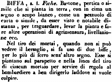| Biffa - S. F. (Ar. Mes.) T. d'Agrimensori, Livellatori, ecc. Bastone, Pertica, o sim., che si pianta in terra, con in cima un oggetto, o scopo bianco, come pezzuolo di carta, o sim., affin di poterlo osservare a notabile distanza, per traguardare, levar piante, o fare altre operazioni d'agricoltura, livellazione, ecc. Magal. Lett. 5. (M.) Vengono segnati dall'impronte de' simulacri, che e' va lasciando, le quali servono a noi come di biffe, per rintracciare il restante del cammino.
