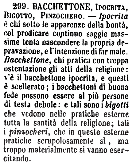 | Bacchettone, Ipocrita, Bigotto, Pinzochero - Ipocrita è chi sotto le apparenze della bontà, col predicare continuo saggie massime tenta nascondere la propria depravazione, e l'intenzione di far male. Bacchettone, chi pratica con troppa ostentazione gli atti della religione: v'è il bacchettone ipocrita, e questi è scellerato; i bacchettoni di buona fede possono essere al più persone di testa debole: e tali sono i bigotti che vedono nelle pratiche esterne tutta la santità della religione; tali i pinzocheri, che in queste esterne pratiche scrupolosamente sì, ma troppo materialmente si vanno esercitando. [immagine] |