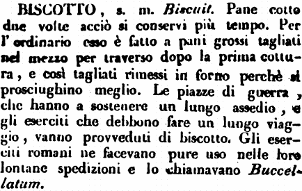 | Biscotto - s. m. Biscuit. Pane cotto due volte acciò si conservi più tempo. Per l'ordinario esso è fatto a pani grossi tagliati nel mezzo per traverso dopo la prima cottura, e così tagliati rimessi in forno perchè si prosciughino meglio. Le piazze di guerra, che hanno a sostenere un lungo assedio, e gli eserciti che debbono fare un lungo viaggio, vanno provveduti di biscotto. Gli eserciti romani ne facevano pure uso nelle loro lontane spedizioni e lo chiamavano Buccellatum. [immagine] |