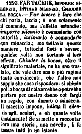 | Far tacere, Imporre silenzio, Intimar silenzio, Chiuder la bocca - Far tacere è fare che chi parla, taccia; è non solamente il comando, ma l'effetto eziandio: imporre silenzio è comandarlo con autorità, intimarlo è comandarlo con minaccia; ma tuttavia queste maniere, tuttochè forti e severe, qualche volta non sortono il loro effetto. Chiuder la bocca, oltre il significato materiale, ne ha uno traslato, che vale dire uno o più ragioni tanto convincenti, che l'altro non sappia che cosa rispondere: si chiude poi la bocca di chi vorrebbe o potrebbe parlare per nostro danno col fargli un regalo, con danaro o minaccia. Il maestro impone, intima il silenzio agli scolari, e oh quante volte inutilmente! Se si mette a raccontar loro una storia, una novella, li fa tacere tutti in un istante. [immagine] |