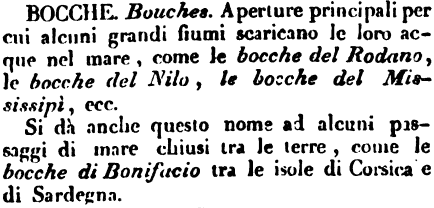 | Bocche - Bouches. Aperture principali per cui alcuni grandi fiumi scaricano le loro acque nel mare, come le bocche del Rodano, le bocche del Nilo, le bocche del Mississipì, ecc.