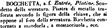 | Bocchetta - s. f. Entrée, Platine. Scudetto della serratura. Piastra di metallo traforata secondo la figura della chiave, che si appone al foro della serratura. Bacchetta contornata a mandorla, a mostacciuola, ecc. [immagine] |