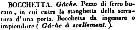| Bocchetta - Gáche. Pezzo di ferro bucato, in cui entra la stanghetta della serratura d'una porta. Bocchetta da ingessare o impiombare (Gáche à scellement.). [immagine] |