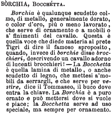 | Borchia, Bocchetta - Borchia è qualunque scudetto colmo, di metallo, generalmente dorato, o color d'oro, più o meno lavorato, che serve di ornamento o a mobili o a' finimenti del cavallo. Questa è quella voce che diede materia al prete Tigri di dire il famoso sproposito, quando, invece di borchie disse brocchieri, descrivendo un cavallo adorno di lucenti brocchieri! - La Bocchetta è quella lamina di metallo, o anche scudetto di legno, che mettesi a' mobili da serrargli, e che serve per vestire, dice il Tommaseo, il buco dove entra la chiave. La Borchia è a puro ornato e può mettersi dove si vuole e piace; la Bocchetta serve ad uso speciale, ma sempre per ornamento. [immagine] |