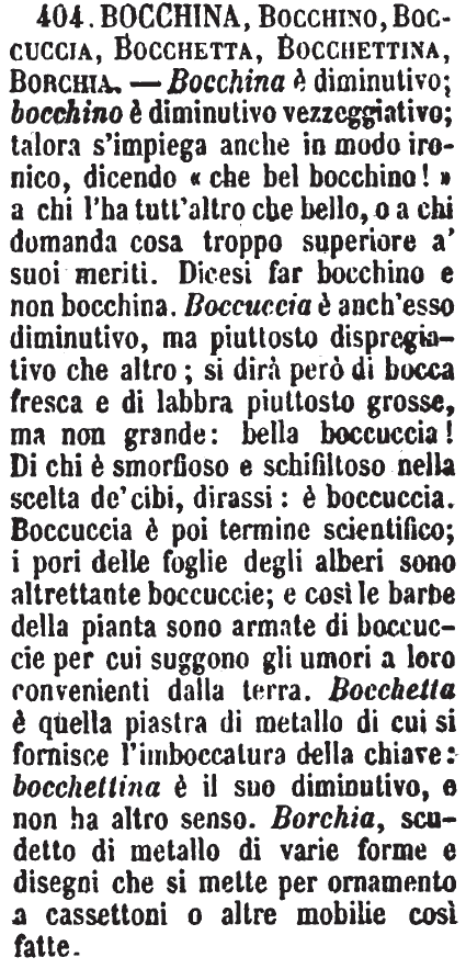 | Bocchina, Bocchino, Boccuccia, Bocchetta, Bocchettina, Borchia - Bocchina è diminutivo; bocchino è diminutivo vezzeggiativo; talora s'impiega anche in modo ironico, dicendo « che bel bocchino! » a chi l'ha tutt'altro che bello, o a chi domanda cosa troppo superiore a' suoi meriti. Dicesi far bocchino e non bocchina. Boccuccia è anch'esso diminutivo, ma piuttosto dispregiativo che altro; si dirà però di bocca fresca e di labbra piuttosto grosse, ma non grande: bella boccuccia! Di chi è smorfioso e schifiltoso nella scelta de' cibi, dirassi: è boccuccia. Boccuccia è poi termine scientifico; i pori delle foglie degli alberi sono altrettante boccuccie; e così le barbe della pianta sono armate di boccuccie per cui suggono gli umori a loro convenienti dalla terra. Bocchetta è quella piastra di metallo di cui si fornisce l'imboccatura della chiave: bocchettina è il suo diminutivo, e non ha altro senso. Borchia, scudetto di metallo di varie forme e disegni che si mette per ornamento a cassettoni o altre mobilie così fatte. [immagine] |