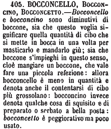 | Bocconcello, Bocconcino, Bocconcetto - Bocconcello e bocconcino sono diminutivi di boccone, sia che questo voglia significare quella quantità di cibo che si mette in bocca in una volta per masticarlo e mandarlo giù; sia che boccone s'impieghi in questo senso, cioè mangiare un boccone, che vale fare una piccola refezione: allora bocconcello è meno in quantità e denota anche il contentarsi di cibo più grossolano: bocconcino invece denota qualche cosa di squisito e di preparato o serbato a bella posta: bocconcetto è peggiorativo ma poco usato. [immagine] |