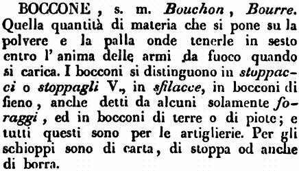| Boccone - s. m. Bouchon, Bourre. Quella quantità di materia che si pone su la polvere e la palla onde tenerle in sesto entro l'anima delle armi da fuoco quando si carica. I bocconi si distinguono in stoppacci o stoppagli V., in sfilacce, in bocconi di fieno, anche detti da alcuni solamente foraggi, ed in bocconi di terre o di piote; e tutti questi sono per le artiglierie. Per gli schioppi sono di carta, di stoppa od anche di borra. [immagine] |