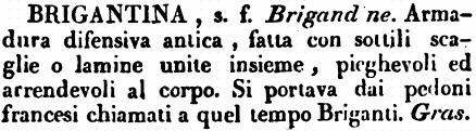 Brigantina - S. f. (Mil.) Specie di Armatura difensiva antica, fatta con sottili scaglie o lamine unite insieme, pieghevoli e accomodabili al corpo. Ghiazzerina. (Quasi voglia dirsi Arma da servire alle brighe, in senso di risse o battaglie.) (Mt.)
