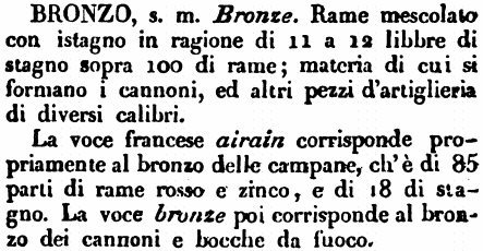 La voce francese airain corrisponde propriamente al bronzo delle campane, ch'è di 85 parti di rame rosso e zinco, e di 18 di stagno. La voce bronze poi corrisponde al bronzo dei cannoni e bocche da fuoco. [immagine] |