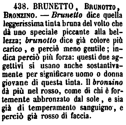| Brunetto, Brunotto, Bronzino - Brunetto dice quella leggerissima tinta bruna del volto che dà uno speciale piccante alla bellezza; brunotto dice già colore più carico, e perciò meno gentile; indica perciò più forza: questi due aggettivi si usano anche sostantivamente per significare uomo o donna giovane di questa tinta. Il bronzino dà più nel rosso, come di chi è fortemente abbronzato dal sole, e sia già di temperamento sanguigno, e perciò già rosso di faccia. [immagine] |