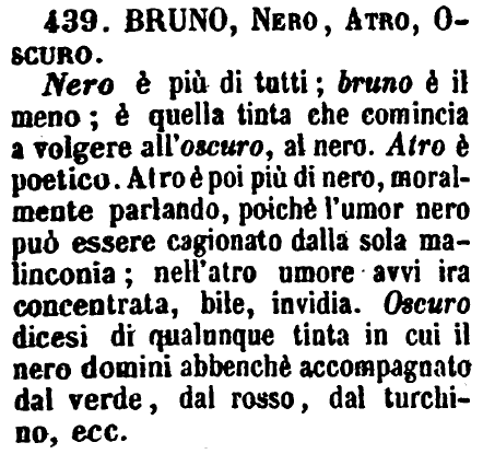 | Bruno, Nero, Atro, Oscuro - Nero è più di tutti; bruno è il meno; è quella tinta che comincia a volgere all'oscuro, al nero. Atro è poetico. Atro è poi più di nero, moralmente parlando, poichè l'umor nero può essere cagionato dalla sola malinconia; nell'atro umore avvi ira concentrata, bile, invidia. Oscuro dicesi di qualunque tinta in cui il nero domini abbenchè accompagnato dal verde, dal rosso, dal turchino, ecc. [immagine] |