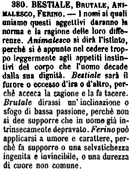 | Bestiale, Brutale, Animalesco, Ferino - I nomi ai quali uniamo questi aggettivi daranno la norma e la ragione delle loro differenze. Animalesco si dirà l'istinto, perchè si è appunto nel cedere troppo leggermente agli appetiti istintivi del corpo che l'uomo decade dalla sua dignità. Bestiale sarà il furore o eccesso d'ira o d'altro, perchè acceca la ragione e la fa tacere. Brutale dirassi un'inclinazione o sfogo di bassa passione, perchè non si dee supporre che in uomo già intrinsecamente depravato. Ferino può applicarsi a umore e carattere, perchè fa supporre o una selvatichezza ingenita e invincibile, o una durezza di cuore non comune. [immagine] |