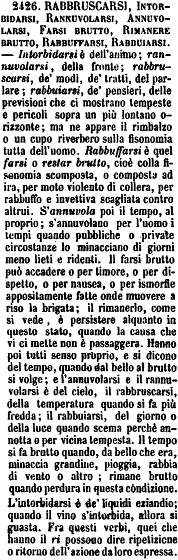 Rabbruscarsi, Intorbidarsi, Rannuvolarsi, Annuvolarsi, Farsi brutto, Rimanere brutto, Rabbuffarsi, Rabbuiarsi - Intorbidarsi è dell'animo; rannuvolarsi, della fronte; rabbruscarsi, de' modi, de' tratti, del parlare; rabbuiarsi, de' pensieri, delle previsioni che ci mostrano tempeste e pericoli sopra un più lontano orizzonte; ma ne appare il rimbalzo o un cupo riverbero sulla fisonomia tutta dell'uomo. Rabbuffarsi è quel farsi o restar brutto, cioè colla fisonomia scomposta, o composta ad ira, per moto violento di collera, per rabbuffo e invettiva scagliata contro altrui. S'annuvola poi il tempo, al proprio; s'annuvolano per l'uomo i tempi quando pubbliche o private circostanze lo minacciano di giorni meno lieti e ridenti. Il farsi brutto può accadere o per timore, o per dispetto, o per nausea, o per ismorfie appositamente fatte onde muovere a riso la brigata; il rimanerlo, come si vede, è persistere alquanto in questo stato, quando la causa che vi ci mette non è passaggera. Hanno poi tutti senso proprio, e si dicono del tempo, quando dal bello al brutto si volge; e l'annuvolarsi e il rannuvolarsi è del cielo, il rabbruscarsi, della temperatura quando si fa più fredda; il rabbuiarsi, del giorno o della luce quando scema perchè annotta o per vicina tempesta. Il tempo si fa brutto quando, da bello che era, minaccia grandine, pioggia, rabbia di vento o altro; rimane brutto quando perdura in questa condizione. L'intorbidarsi è de' liquidi eziandio; quando il vino s'intorbida, allora si guasta. Fra questi verbi, quei che hanno il ri possono dire ripetizione o ritorno dell'azione da loro espressa. [immagine]