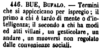 | Bue, Bufalo - Termini che si appiccicano per ispregio; il primo a chi è tardo di mente o d'intelligenza; il secondo a chi ha modi ed atti villani, un gesticolare, un andare, un muoversi non regolato dalle convenienze sociali. [immagine] |