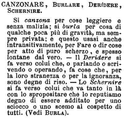 | Burlare, Scherzare, Ingannare - «Lo scherzo è più innocente talvolta, e più amichevole. Si fa una burla anco a gente non nota od estrania, per trastullare sè e la brigata». A.