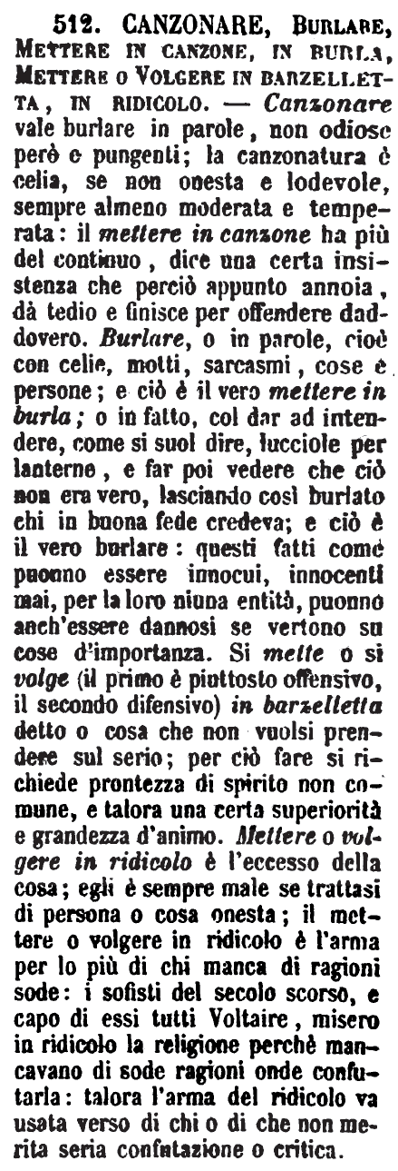 | Canzonare, Burlare, Deridere, Schernire - Si canzona per cose leggiere e senza malizia; si burla per cosa di qualche poca più di gravità, ma sempre privata; e questo usasi anche intransitivamente, per Fare o dir cose per atto di puro scherzo, e spesso lontane dal vero. - Il Deridere si fa verso colui che, o parlando o scrivendo o operando, fa cose che, per la loro stranezza, o per la ignoranza, sono degne di riso. - Lo Schernire si fa verso colui che va tanto in là con lo spropositare che lo reputiamo degno di essere additato per uno sciocco o uno scemo al cospetto di tutti. (Vedi Burla). [immagine] |