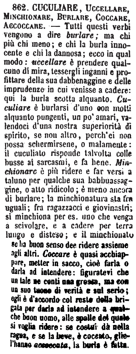 | Cuculiare, Uccellare, Minchionare, Burlare, Coccare, Accoccare - Tutti questi verbi vengono a dire burlare; ma chi più chi meno; e chi la burla innocente e chi la dannosa; ecco in qual modo: uccellare è prendere qualcuno di mira, tessergli inganni e profittare della sua dabbenaggine e delle imprudenze in cui venisse a cadere: qui la burla scotta alquanto. Cuculiare è burlarsi d'uno con motti alquanto pungenti, un po' amari, valendoci d'una nostra superiorità di spirito, se non altro, perch'ei non possa schermirsene, o malamente: il cuculiato risponde talvolta colle busse ai sarcasmi, e fa bene. Minchionare è più ridere e far versi a taluno per qualche sua babbuassaggine, o atto ridicolo; è meno ancora di burlare; la minchionatura sta fra uguali; fra ragazzacci e giovinastri; si minchiona per es. uno che venga a scivolare, e a cadere per terra lungo e disteso; e il minchionato se ha buon senso dee ridere assieme agli altri. Coccare è quasi acchiappare, metter in sacco, cioè farla o darla ad intendere: figuratevi che un tale ne conti una grossa, ma con un suo tuono di verità e sul serio; egli è d'accordo col resto della brigata per darla ad intendere a qualche buon uomo, alle spalle del quale si voglia ridere: se costui dà nella ragna, e se la beve, è coccato, gliel'hanno accoccata, la burla è fatta. [immagine] |