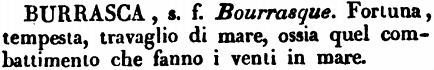 Burrasca - s. f. Bourrasque. Fortuna, tempesta, travaglio di mare, ossia quel combattimento che fanno i venti in mare. [immagine]