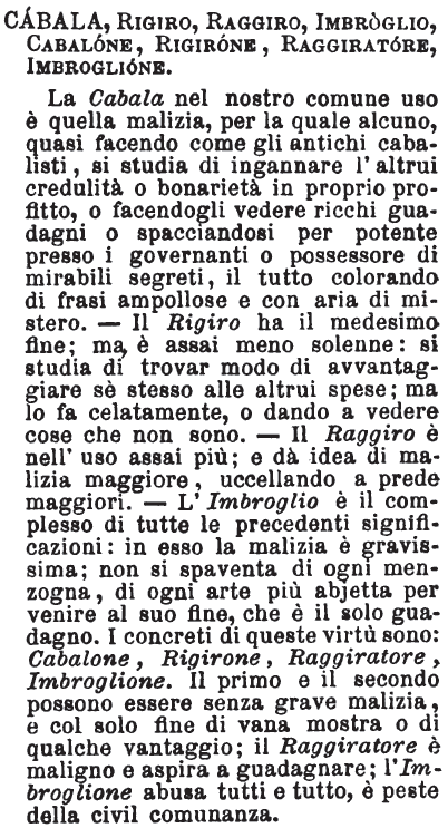 | Cabala, Rigiro, Raggiro, Imbroglio, Cabalone, Rigirone, Raggiratore, Imbroglione - La Cabala nel nostro comune uso è quella malizia, per la quale alcuno, quasi facendo come gli antichi cabalisti, si studia di ingannare l'altrui credulità o bonarietà in proprio profitto, o facendogli vedere ricchi guadagni o spacciandosi per potente presso i governanti o possessore di mirabili segreti, il tutto colorando di frasi ampollose e con aria di mistero. - Il Rigiro ha il medesimo fine; ma, è assai meno solenne: si studia di trovar modo di avvantaggiare sè stesso alle altrui spese; ma lo fa celatamente, o dando a vedere cose che non sono. - Il Raggiro è nell'uso assai più; e dà idea di malizia maggiore, uccellando a prede maggiori. - L'Imbroglio è il complesso di tutte le precedenti significazioni: in esso la malizia è gravissima; non si spaventa di ogni menzogna, di ogni arte più abjetta per venire al suo fine, che è il solo guadagno. I concreti di queste virtù sono: Cabalone, Rigirone, Raggiratore, Imbroglione. Il primo e il secondo possono essere senza grave malizia, e col solo fine di vana mostra o di qualche vantaggio; il Raggiratore è maligno e aspira a guadagnare; l'Imbroglione abusa tutti e tutto, è preste della civil comunanza. [immagine] |