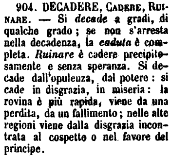 | Decadere, Cadere, Ruinare - Si decade a gradi, di qualche grado; se non s'arresta nella decadenza, la caduta è completa. Ruinare è cadere precipitosamente e senza speranza. Si decade dall'opulenza, dal potere: si cade in disgrazia, in miseria: la rovina è più rapida, viene da una perdita, da un fallimento; nelle alte regioni viene dalla disgrazia incontrata al cospetto o nel favore del principe. [immagine] |