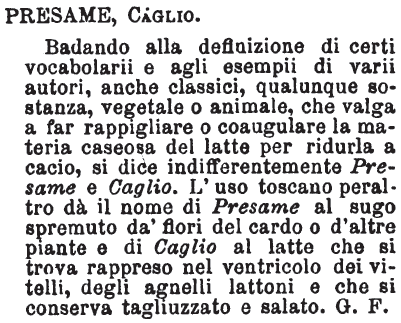 Presame, Caglio - Badando alla definizione di certi vocabolarii e agli esempii di varii autori, anche classici, qualunque sostanza, vegetale o animale, che valga a far rappigliare o coagulare la materia caseosa del latte per ridurla a cacio, si dice indifferentemente Presame e Caglio. L'uso toscano peraltro dà il nome di Presame al sugo spremuto da' fiori del cardo o d'altre piante e di Caglio al latte che si trova rappreso nel ventricolo dei vitelli, degli agnelli lattoni e che si conserva tagliuzzato e salato. G. F. [immagine]