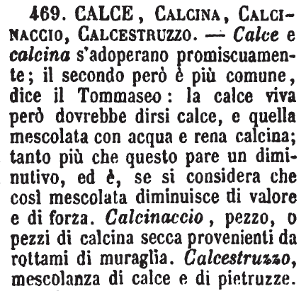 | Calce, Calcina, Calcinaccio, Calcestruzzo - Calce e calcina s'adoperano promiscuamente; il secondo però è più comune, dice il Tommaseo: la calce viva però dovrebbe dirsi calce, e quella mescolata con acqua e rena calcina; tanto più che questo pare un diminutivo, ed è, se si considera che così mescolata diminuisce di valore e di forza. Calcinaccio, pezzo, o pezzi di calcina secca provenienti da rottami di muraglia. Calcestruzzo, mescolanza di calce e di pietruzze. [immagine] |