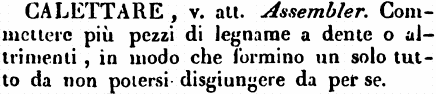 | Calettare - v. att. Assembler. Commettere più pezzi di legname a dente o altrimenti, in modo che formino un solo tutto da non potersi disgiungere da per se. [immagine] |