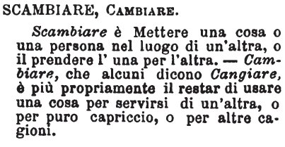 | Scambiare, Cambiare - Scambiare è Mettere una cosa o una persona nel luogo di un'altra, o il prendere l'una per l'altra. - Cambiare, che alcuni dicono Cangiare, è più propriamente il restar di usare una cosa per servirsi di un'altra, o per puro capriccio, o per altre ragioni. [immagine] |