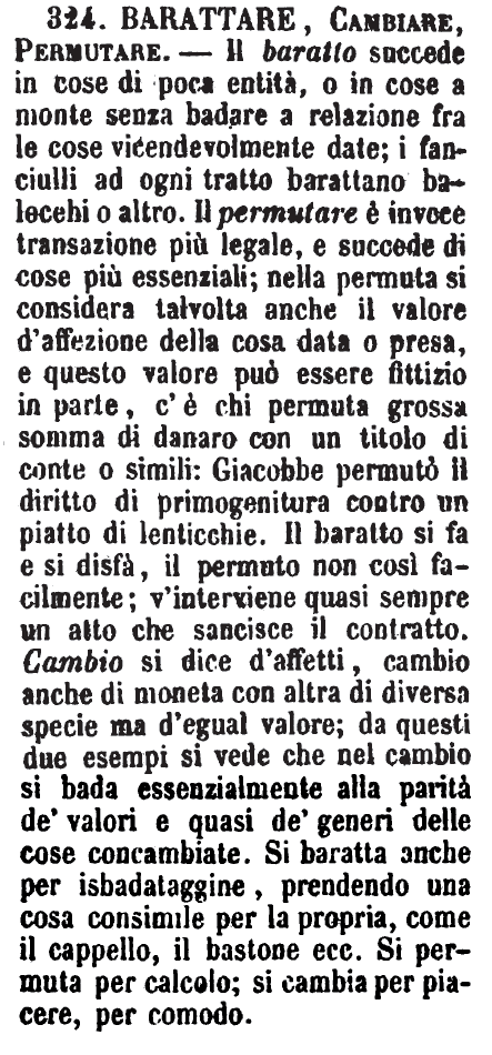 | Barattare, Cambiare, Permutare - Il baratto succede in cose di poca entità, o in cose a monte senza badare a relazione fra le cose vicendevolmente date; i fanciulli ad ogni tratto barattano balocchi o altro. Il permutare è invece transazione più legale, e succede di cose più essenziali; nella permuta si considera talvolta anche il valore d’affezione della cosa data o presa, e questo valore può essere fittizio in parte, c’è chi permuta grossa somma di danaro con un titolo di conte o simili: Giacobbe permutò il diritto di primogenitura contro un piatto di lenticchie. Il baratto si fa e si disfà, il permuto non così facilmente; v’interviene quasi sempre un atto che sancisce il contratto. Cambio si dice d’affetti, cambio anche di moneta con altra di diversa specie ma d’egual valore; da questi due esempi si vede che nel cambio si bada essenzialmente alla parità de’ valori e quasi de’ generi delle cose concambiante. Si baratta anche per isbadataggine, prendendo una cosa consimile per la propria, come il cappello, il bastone ecc. Si permuta per calcolo; si cambia per piacere, per comodo. [immagine] |