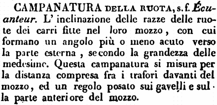 | Campanatura della ruota - s. f. Écuanteur. L'inclinazione delle razze delle ruote dei carri fitte nel loro mozzo, con cui formano un angolo più o meno acuto verso la parte esterna, secondo la grandezza delle medesime. Questa campanatura si misura per la distanza compresa fra i trafori davanti del mozzo, ed un regolo posato sui gavelli e sulla parte anteriore del mozzo. [immagine] |