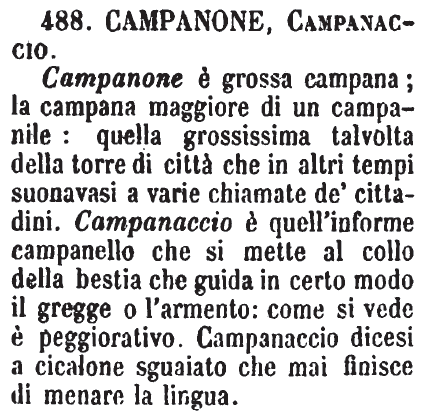 Campanone, Campanaccio - Campanone è grossa campana; la campana maggiore di un campanile: quella grossissima talvolta della torre di città che in altri tempi suonavasi a varie chiamate de' cittadini. Campanaccio è quell'informe campanello che si mette al collo della bestia che guida in certo modo il gregge o l'armento: come si vede è peggiorativo. Campanaccio dicesi a cicalone sguaiato che mai finisce di menare la lingua. [immagine]
