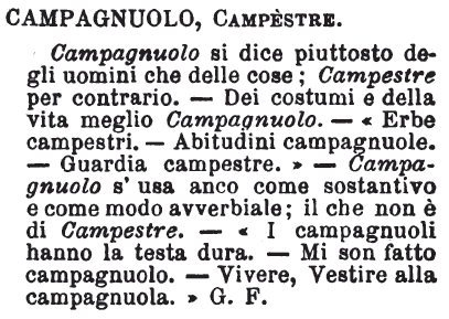 | Campagnuolo, Campestre - Campagnuolo si dice piuttosto degli uomini che delle cose; Campestre per contrario. - Dei costumi e della vita meglio Campagnuolo. - «Erbe campestri. - Abitudini campagnuole. - Guardia campestre.» - Campagnuolo s'usa anco come sostantivo e come modo avverbiale; il che non è di Campestre. - « I campagnuoli hanno la testa dura. - Mi son fatto campagnuolo. - Vivere, Vestire alla campagnuola.» G. F. [immagine] |