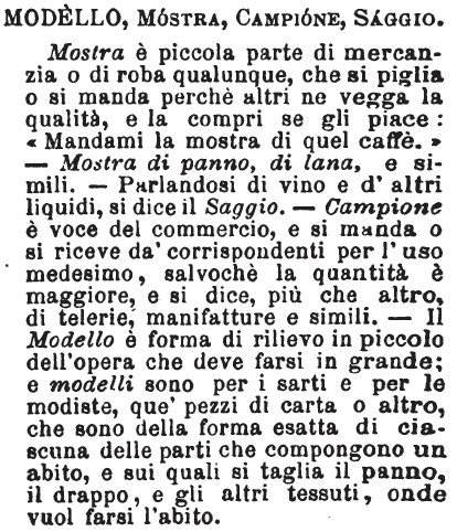 | Modello, Mostra, Campione, Saggio - Mostra è piccola parte di mercanzia o di roba qualunque, che si piglia o si manda perchè altri ne vegga la qualità, e la compri se gli piace: «Mandami la mostra di quel caffè. » - Mostra di panno, di lana, e simili. - Parlandosi di vino e d'altri liquidi, si dice il Saggio. - Campione è voce del commercio, e si manda o si riceve da' corrispondenti per l'uso medesimo, salvochè la quantità è maggiore, e si dice, più che altro, di telerie, manifatture e simili. - Il Modello è forma di rilievo in piccolo dell'opera che deve farsi in grande; e modelli sono per i sarti e per le modiste, que' pezzi di carta o altro, che sono della forma esatta di ciascuna delle parti che compongono un abito, e sui quali si taglia il panno, il drappo, e gli altri tessuti, onde vuol farsi l'abito. [immagine] |
