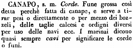 Canapo - s. m. Corde. Fune grossa così detta perchè fatta di canape, e serve a tirar pesi o direttamente o per mezzo dei bozzeli, delle taglie calcesi e ordigni diversi per uso delle navi ecc. I marinai dicono quasi sempre cavi per significare le corde o funi. [immagine]