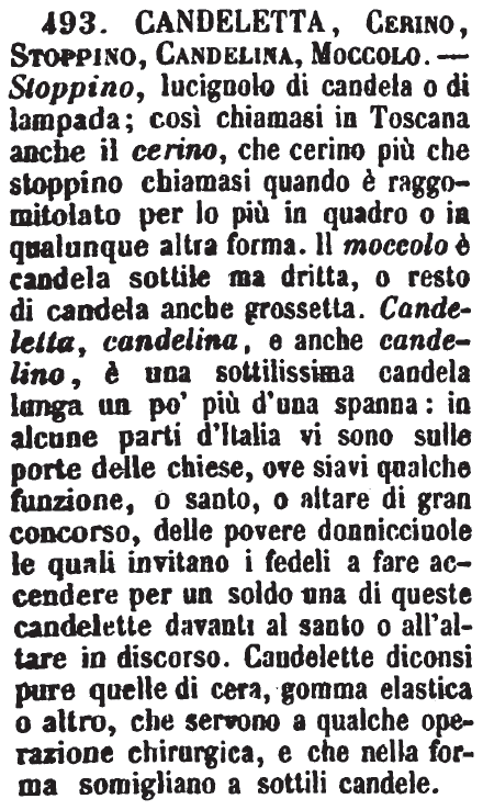 | Candeletta, Cerino, Stoppino, Candelina, Moccolo - Stoppino, lucignolo di candela o di lampada; così chiamasi in Toscana anche il cerino, che cerino più che stoppino chiamasi quando è raggomitolato per lo più in quadro o in qualunque altra forma. Il moccolo è candela sottile ma dritta, o resto di candela anche grossetta. Candeletta, candelina, e anche candelino, è una sottilissima candela lunga un po' più di una spanna: in alcune parti d'Italia vi sono sulle porte delle chiese, ove siavi qualche funzione, o santo, o altare di gran concorso, delle povere donnicciuole le quali invitano i fedeli a fare accendere per un soldo una di queste candelette davanti al santo o all'altare in discorso. Candelette diconsi pure quelle di cera, gomma elastica o altro, che servono a qualche operazione chirurgica, e che nella forma somigliano a sottili candele. [immagine] |