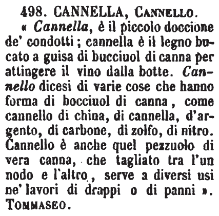 Cannella, Cannello - «Cannella, è il piccolo doccione de' condotti; cannella è il legno bucato a guisa di bucciuol di canna per attingere il vino dalla botte. Cannello dicesi di varie cose che hanno forma di bocciuol di canna, come cannello di china, di cannella, d'argento, di carbone, di zolfo, di nitro. Cannello è anche quel pezzuolo di vera canna, che tagliato tra l'un nodo e l'altro, serve a diversi usi ne' lavori di drappi o di panni». Tommaseo. [immagine]