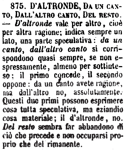 | D’altronde, Da un canto, Dall’altro canto, Del resto - D'altronde vale per altro, cioè per altra ragione; indica sempre un lato, una parte speculativa: da un canto, dall'altro canto si corrispondono quasi sempre, se non espressamente, almeno per sottinteso; il primo concede, il secondo oppone: da un canto avete ragione, ma dall'altro no, assolutamente. Questi due primi possono esprimere cosa tutta speculativa, ma eziandio cosa materiale; il d'altronde, no. Del resto sembra far abbandono di ciò che precede e non occuparsi proprio che del rimanente. [immagine] |