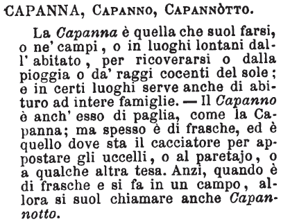 | Capanna, Capanno, Capannotto - La Capanna è quella che suol farsi, o ne' campi, o in luoghi lontani dall'abitato, per ricoverarsi o dalla pioggia o da' raggi cocenti del sole; e in certi luoghi serve anche di abituro ad intere famiglie. - Il Capanno è anch'esso di paglia, come la Capanna; ma spesso è di frasche, ed è quello dove sta il cacciatore per appostare gli uccelli, o al paretajo, o a qualche altra tesa. Anzi, quando è di frasche e si fa in un campo, allora si suol chiamare anche Capannotto. [immagine] |