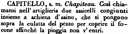 | Capitello - s. m. Chapiteau. Così chiamansi nell'artiglieria due assicelli congiunti insieme a schiena d'asino, che si pongono sopra la culatta del pezzo per coprire il focone affinchè la pioggia non v'entri. [immagine] |