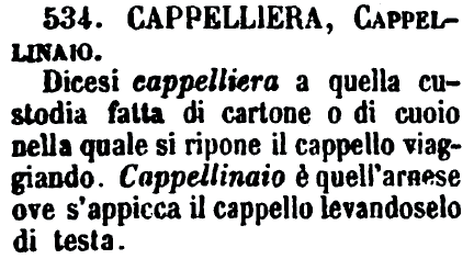 | Cappelliera, Cappellinaio - Dicesi cappelliera a quella custodia fatta di cartone o di cuoio nella quale si ripone il cappello viaggiando. Cappellinaio è quell'arnese ove s'appicca il cappello levandoselo di testa. [immagine] |