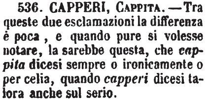 | Capperi, Cappita - Tra queste due esclamazioni la differenza è poca, e quando pure si volesse notare, la sarebbe questa, che cappita dicesi sempre o ironicamente o per celia, quando capperi dicesi talora anche sul serio. [immagine] |