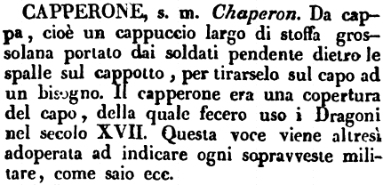 | Capperone - s. m. Chaperon. Da cappa, cioè un cappuccio largo di stoffa grossolana portato dai soldati pendente dietro le spalle sul cappotto, per tirarselo sul capo ad un bisogno. Il capperone era una copertura del capo, della quale fecero uso i Dragoni nel secolo XVII. Questa voce viene altresì adoperata ad indicare ogni sopravveste militare, come saio ecc. [immagine] |