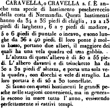 Caravella, o Cravella - s. f. È anche una specie di bastimento peschereccio della costa di Normandia. Questi bastimenti hanno da 34 a 36 piedi di chiglia, 12 a 13 piedi di larghezza, 6 a 7 piedi di madiere, 5 o 6 piedi di puntale o incavo, e sono lunghe da 36 a 40 piedi. Il loro ponte è molto basso, portano due alberi, il maggiore dei quali ha una vela quadra ed una gabbia.