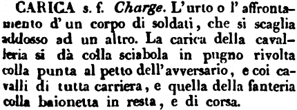 | Carica - s. f. Charge. L'urto o l'affrontamento d'un corpo di soldati, che si scaglia addosso ad un altro. La carica della cavalleria si dà colla sciabola in pugno rivolta colla punta al petto dell'avversario, e coi cavalli di tutta carriera, e quella della fanteria colla baionetta in resta, e di corsa. [immagine] |
