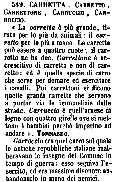 | Carretta, Carretto, Carrettone, Carruccio, Carroccio - «La carretta è più grande, tirata per lo più da animali: il carretto per lo più a mano. La carretta può essere a quattro ruote; il carretto ne ha due. Carrettone è accrescitivo di carretta e non di carretto: ed è quella specie di carro che serve per domare ed esercitare i cavalli. Poi carrettoni si dicono quelle grandi carrette che servono a portar via le immondizie dalle strade. Carruccio è quell'arnese di legno con quattro girelle ove si mettono i bambini perché imparino ad andare». Tommaseo.