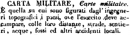 | Carta militare - Carte militaire. È quella su cui sono figurati dagl'ingegneri topografici i paesi, ove l'esercito deve accampare, colle loro distanze, strade, sentieri, acque, fossi ed altri accidenti locali. [immagine] |