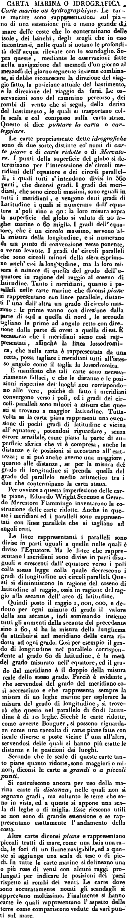 | Carta marina o idrografica - Carte marine ou hydrographique. Le carte marine sono rappresentazioni sul piano di una estensione più o meno grande di mare delle coste che lo conterminano delle isole, dei banchi, degli scogli che in esso incontransi, nelle quali si notano le profondità dell'acqua rilevate con lo scandaglio. Sopra queste, mediante le osservazioni fatte nella navigazione dal mezzodì d'un giorno al mezzodì del giorno seguente insieme combinate, si debbe riconoscere la direzione del viaggio fatto, la posizione attuale del bastimento, e la direzione del viaggio da farsi. Le osservazioni sono del cammino percorso, dei rombi di vento che si seguì, della deriva del bastimento, le quali si trasportano colla scala e col compasso sulla carta stessa. Questo si dice puntare la carta o carteggiare.